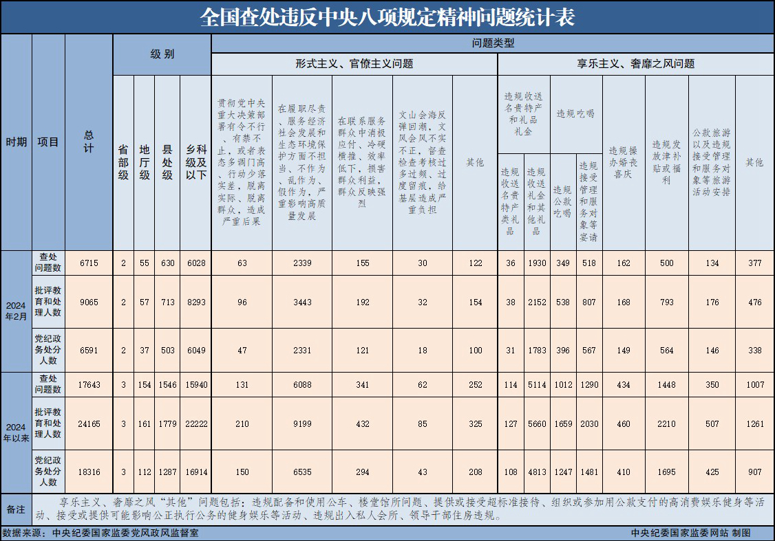 3月26日,中央纪委国家监委公布了2024年2月全国查处违反中央八项规定精神问题汇总情况。当月,全国共查处违反中央八项规定精神问题6715起,批评教育和处理9065人,其中党纪政务处分6591人,这是连续第126个月公布月报数据。