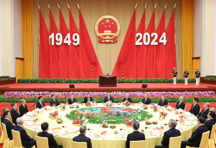 9月30日晚,庆祝中华人民共和国成立75周年招待会在北京人民大会堂隆重举行。习近平、李强、赵乐际、王沪宁、蔡奇、丁薛祥、李希、韩正等党和国家领导人与约3000名中外人士欢聚一堂,共庆新中国75周年华诞。新华社记者 黄敬文 摄