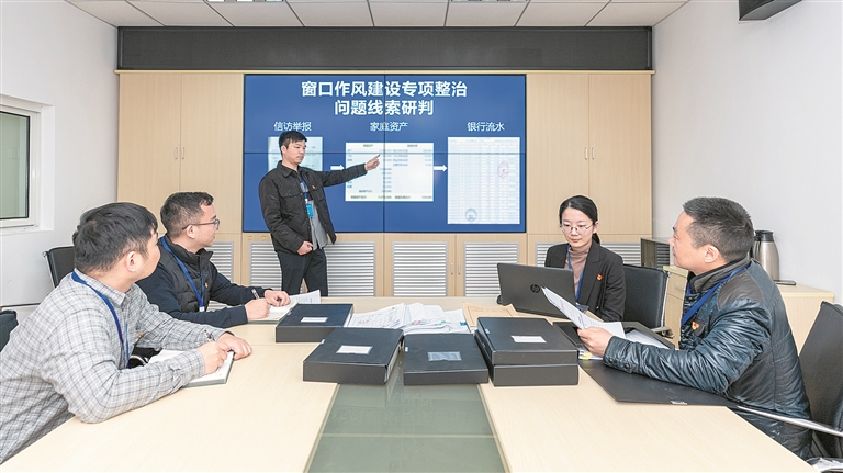 上海市青浦区纪委监委聚焦窗口服务领域作风建设,紧抓案件查办,纠治不正之风和腐败问题。图为近日,该区纪检监察干部研判问题线索。刘明星 摄