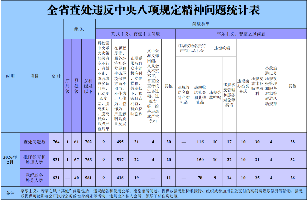 2026年2月,黑龙江省纪检监察机关共查处违反中央八项规定精神问题764起,批评教育和处理831人,其中党纪政务处分621人。 从查处问题类型看,在履职尽责、服务经济社会发展和生态环境保护方面不担当、不作为、乱作为、假作为,严重影响高质量发展方面,2月查处问题495起,占查处形式主义、官僚主义问题总数的90.2%。2月,查处的违规收送名贵特产和礼品礼金、违规发放津补贴或福利、违规吃喝3类问题,分别占查处享乐主义、奢靡之风问题总数的54%、14%、12.6%。