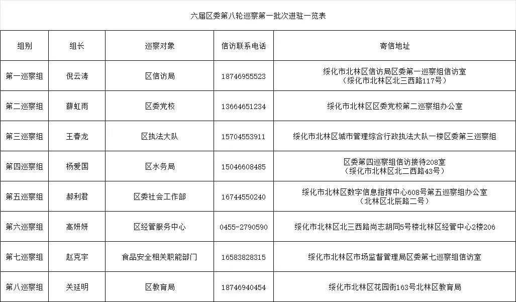按照区委部署,六届区委第八轮巡察对区统计局、区执法大队、区招商引资服务中心、区委党校、区委社会工作部等5个党组织开展常规巡察;对区水务局、区信访局、区经管服务中心、区教育局、新华乡红星村、连岗乡高兴村等6个党组织开展巡察“回头看”;对全区食品安全相关职能部门开展专项巡察。截至4月16日,8个巡察组完成第一批次进驻工作。
